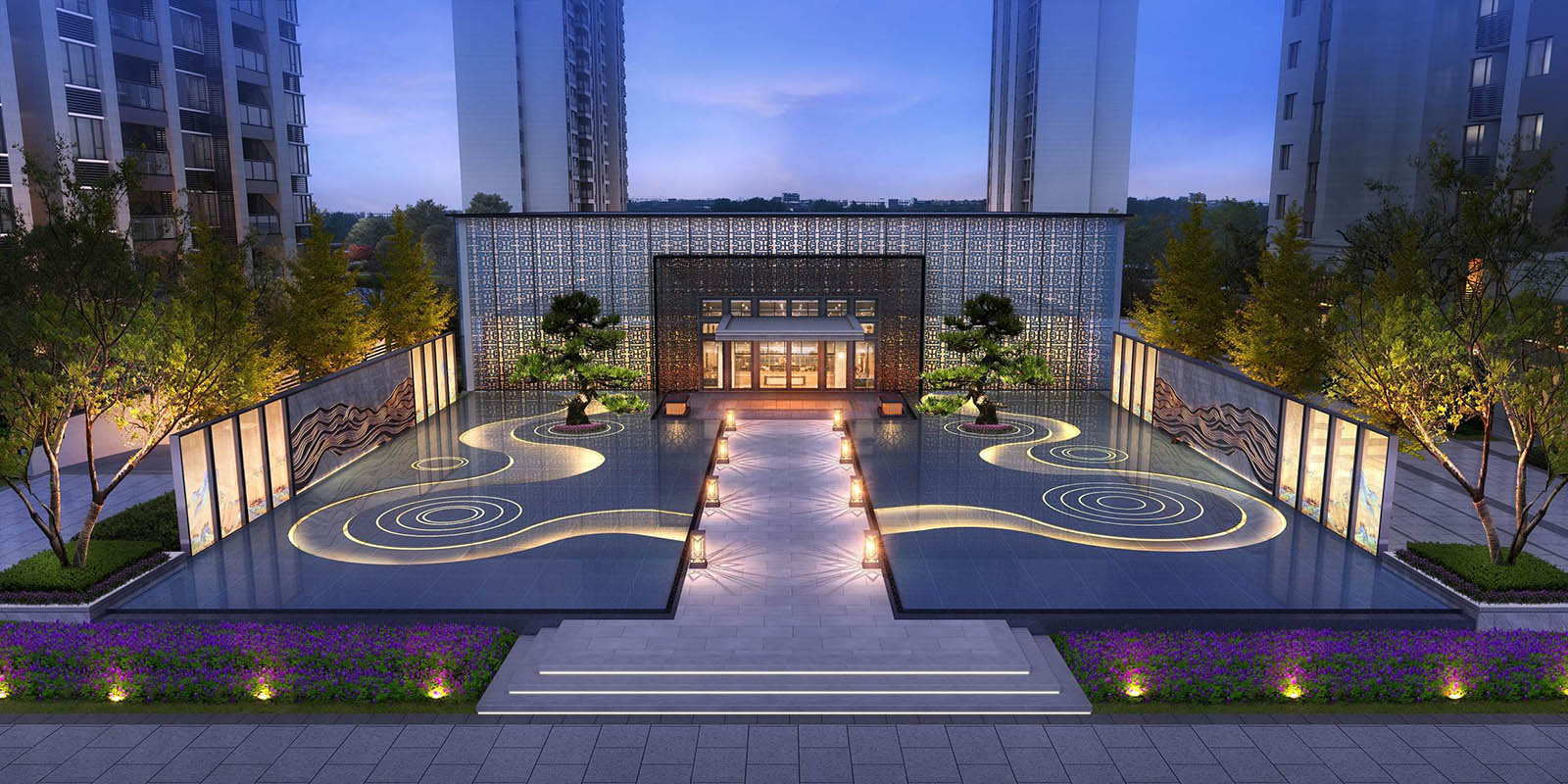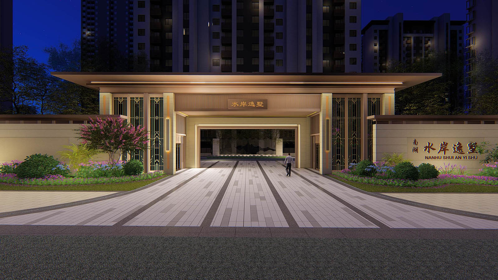 鏡面水景及景墻屏風(fēng)的脈絡(luò)肌理與地塊東側(cè)的南湖相呼應(yīng),以此與南湖·水岸逸墅案名產(chǎn)生共鳴,景觀將月印萬(wàn)川,處處皆圓為文化內(nèi)涵具象,寓意萬(wàn)川歸源,圓融無(wú)礙,精英階層的生活處事態(tài)度與精神追求。