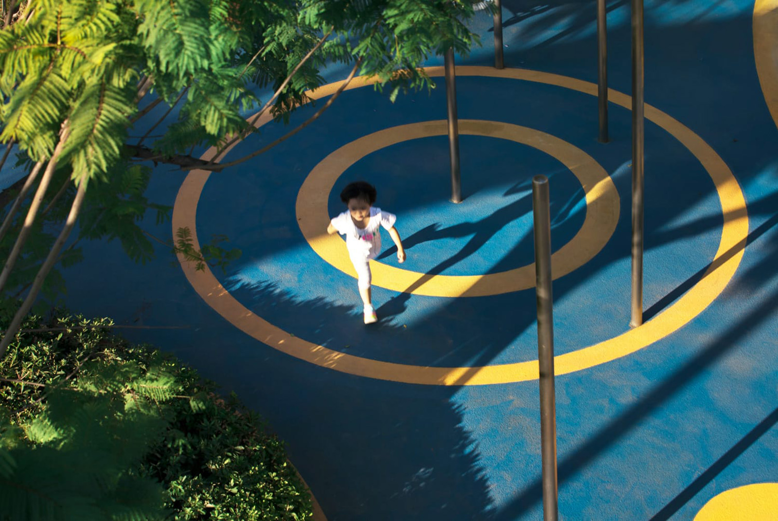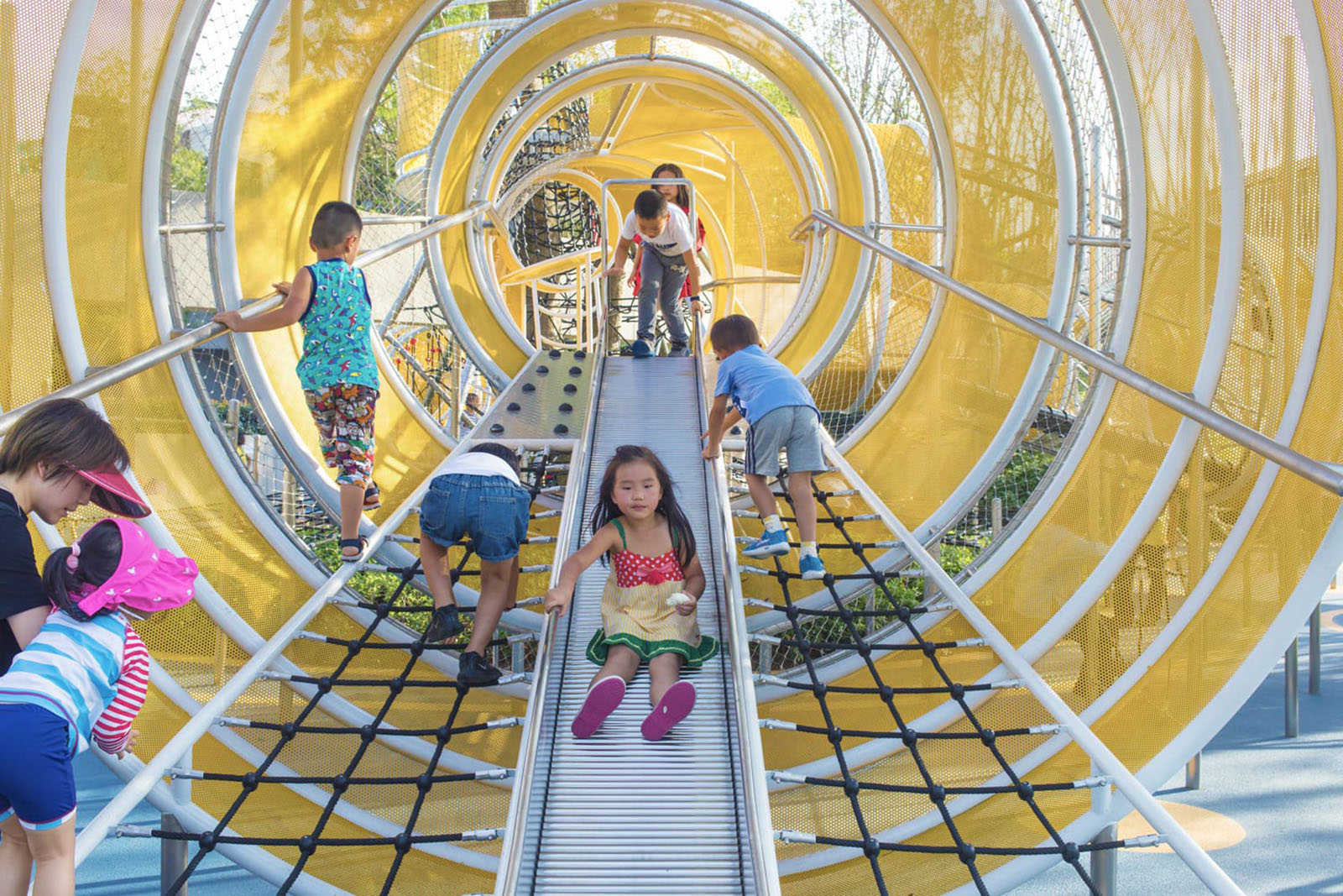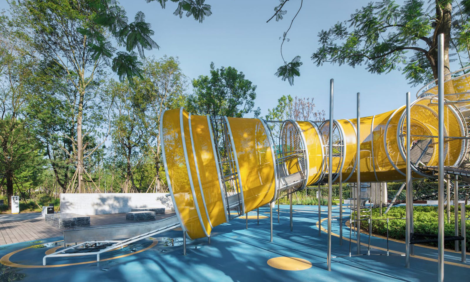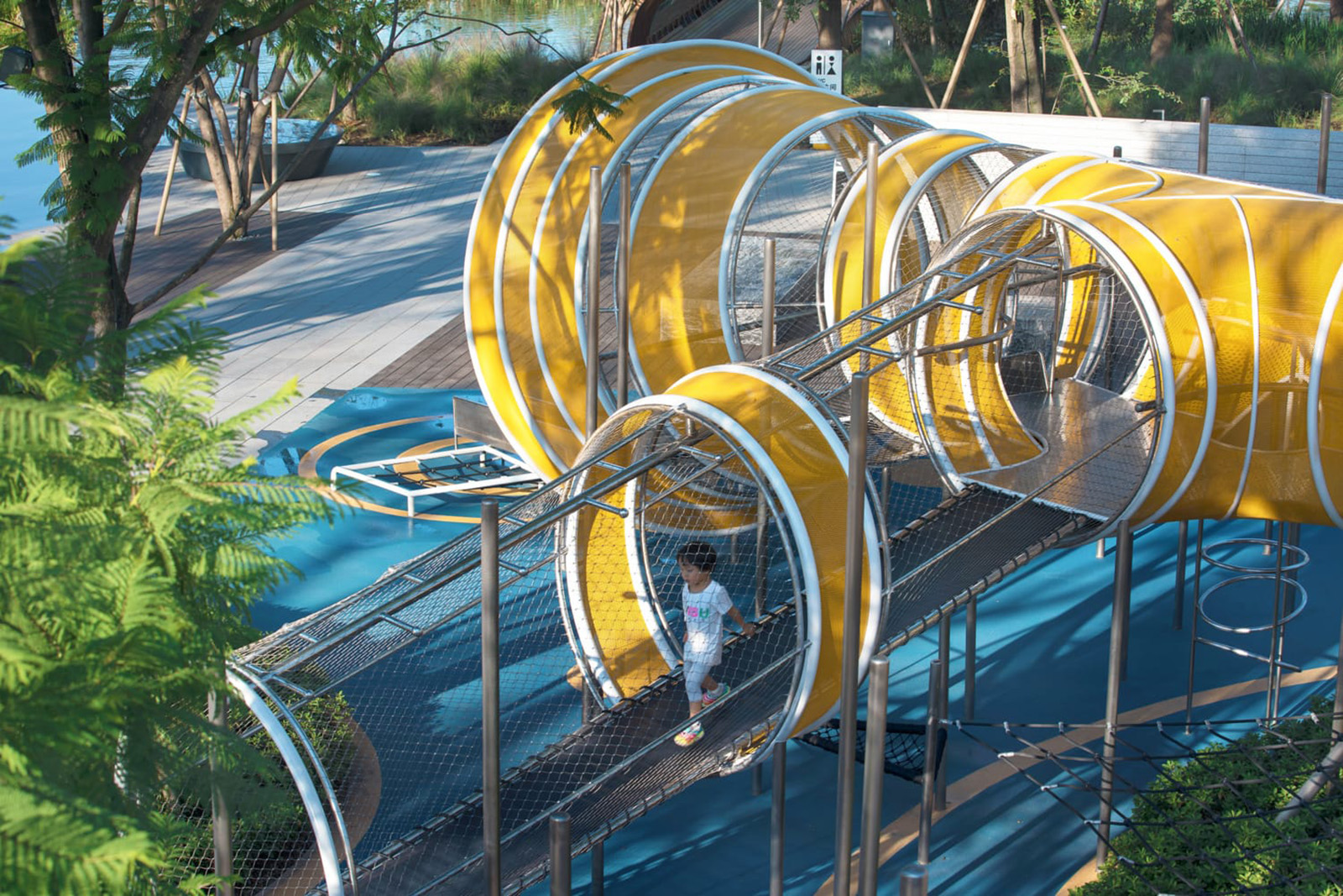 以學齡大童冒險為設計主題,架空的冒險管道、吊橋、方盒子滑梯等設計,激發(fā)兒童的探索欲、合作精神、冒險精神。拓展兒童的空間想象力。同時林蔭大樹與器械相結合,探險空間猶如穿梭、浮空在林中,兒童伸手能觸碰到大樹的枝條,更加增強了兒童與自然的互動。