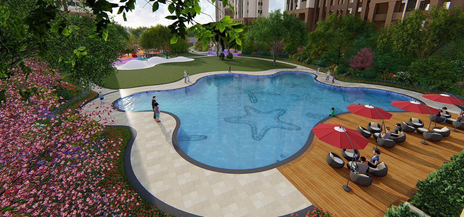 將海星形態(tài)衍化成兒童主題戲水池,池底海星馬賽克鋪裝為兒童講述海星在海洋中茁壯成長的趣味旅程。