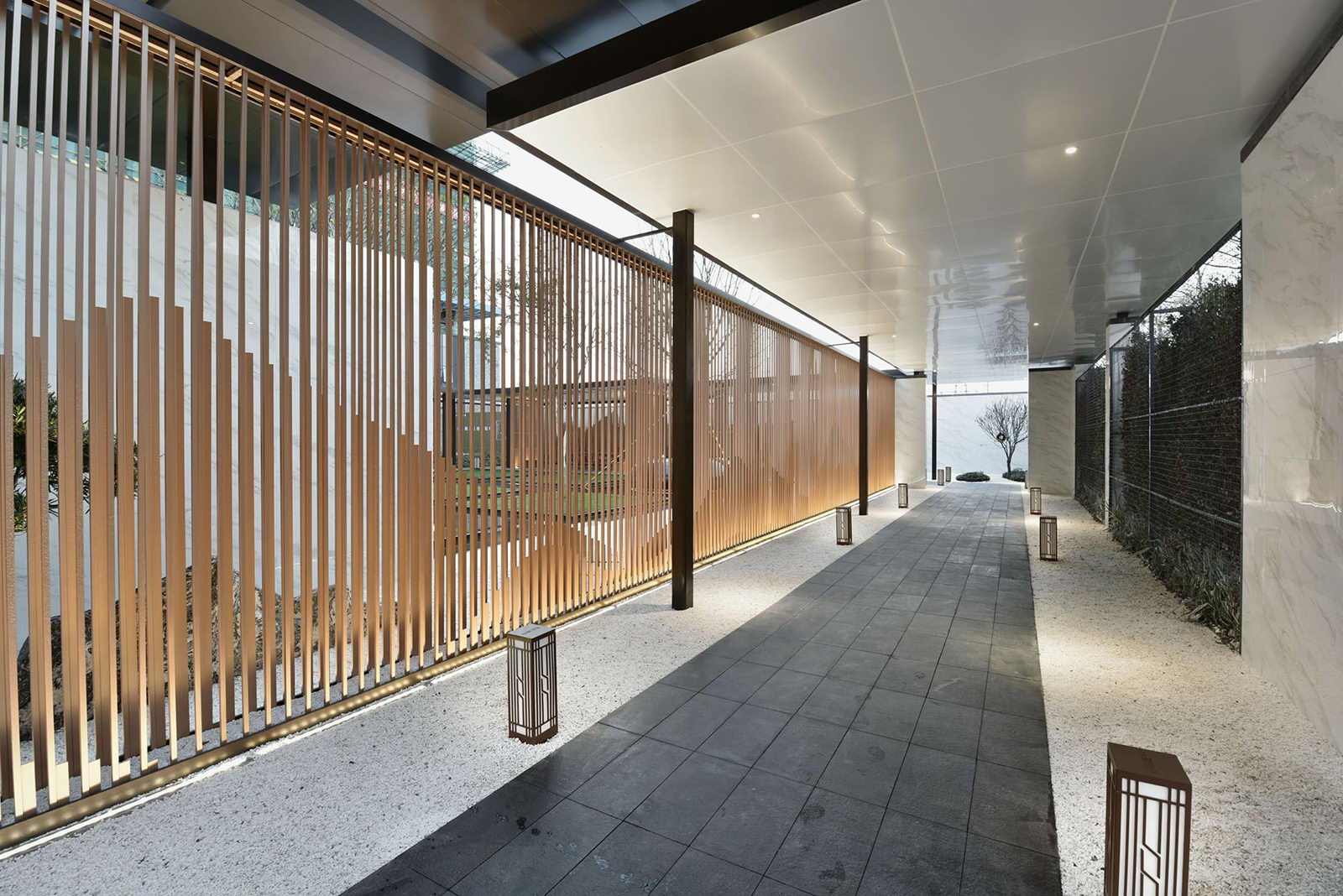 “L形”廊架給予客戶無形的引導,帶領客戶進入到更深層次空間,廊架頂板布置喜鵲藝術裝置,以雀幸喜歸為主題,引導賓客進入售樓部。