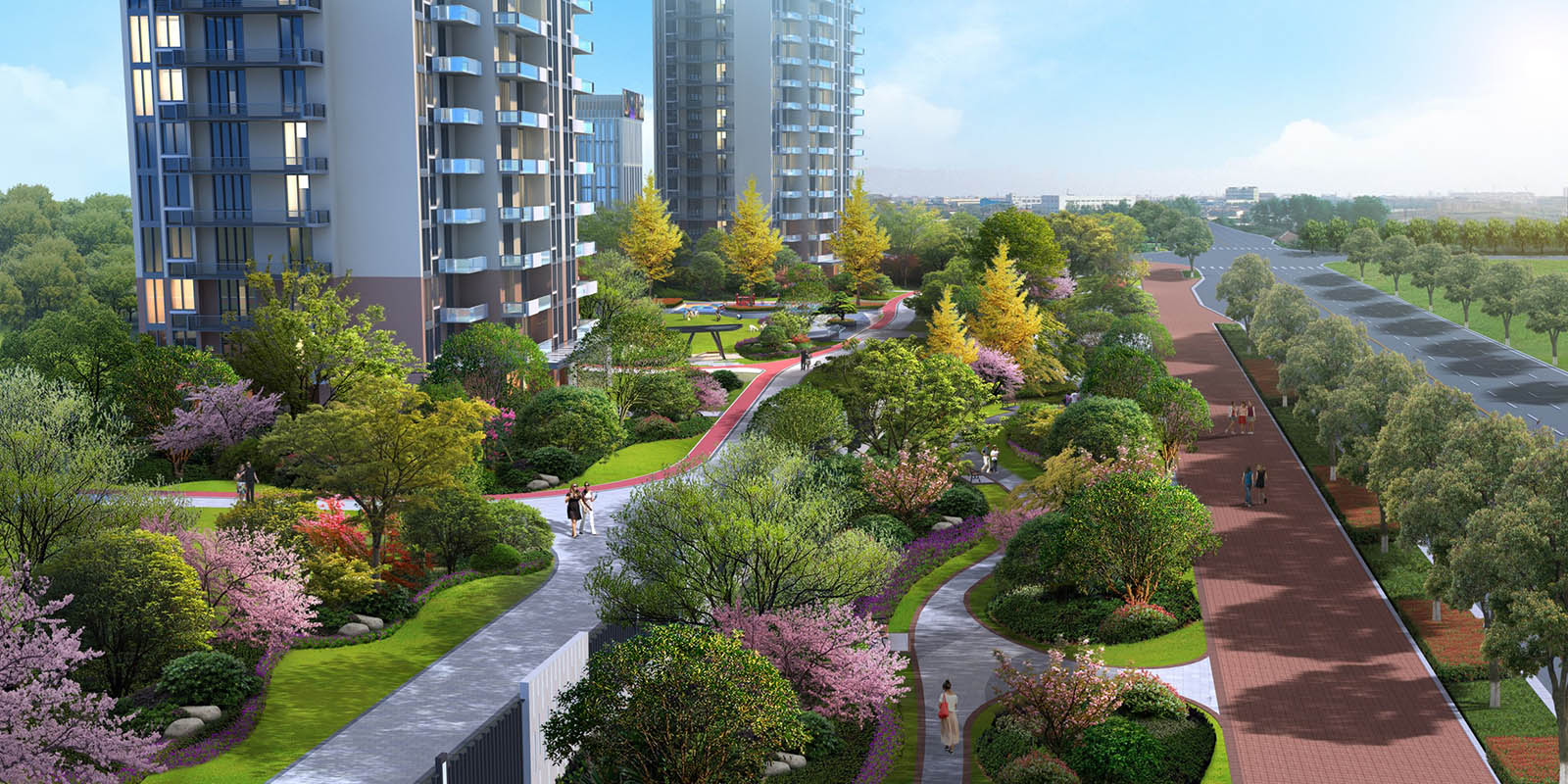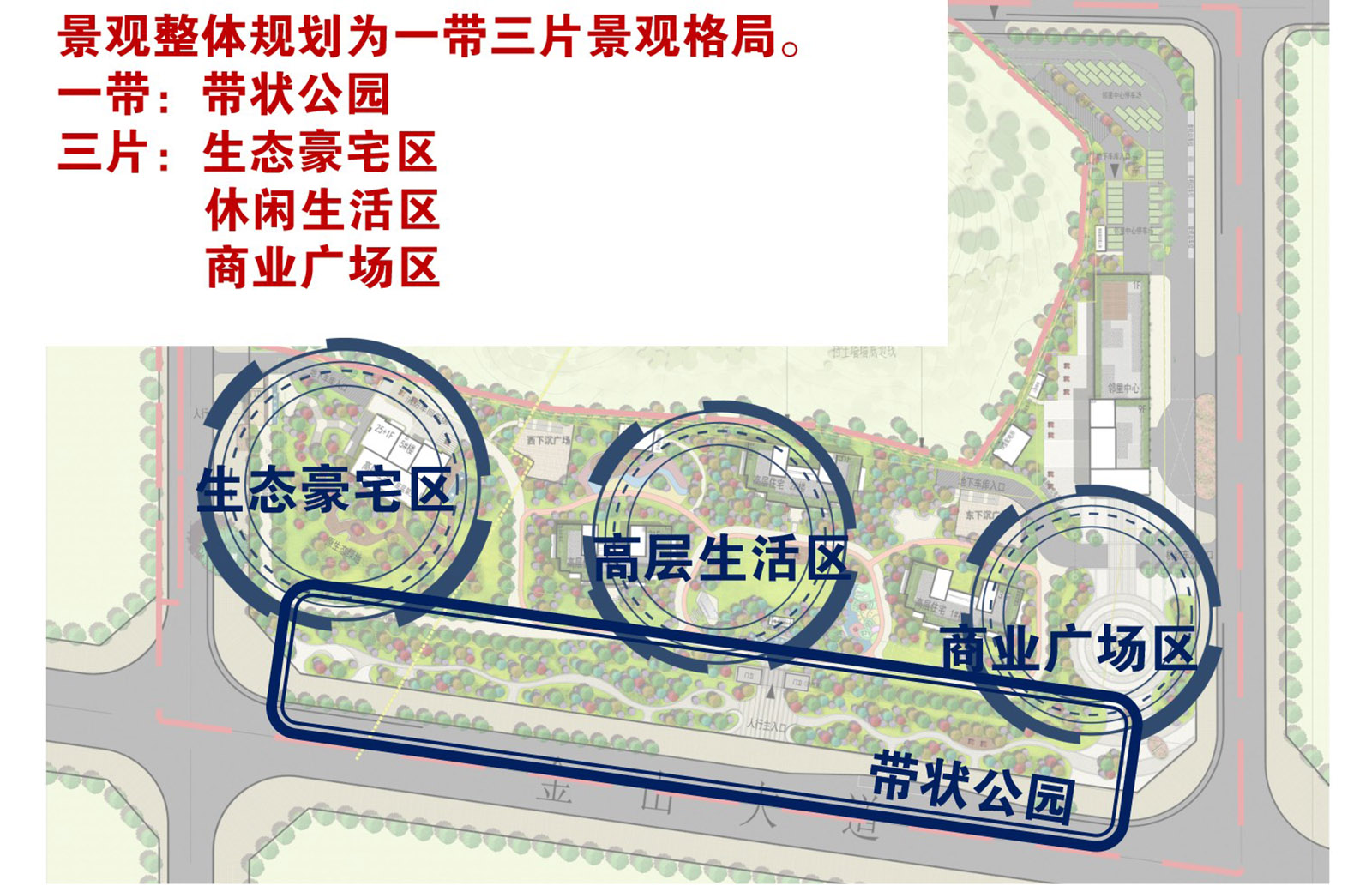 帶狀公園將住區(qū)與城市道路分離,動靜分離,提升小區(qū)的品質(zhì)與生態(tài)環(huán)境,為居民提供一處住區(qū)外的休閑、活動場所,使區(qū)域更加親民、宜居,以此提升住區(qū)的附加值。