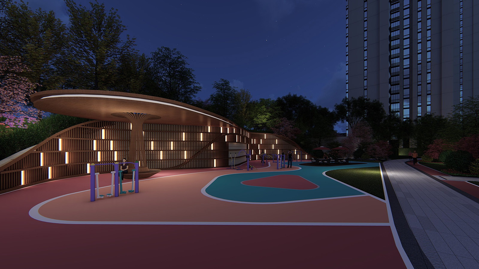 健康生活才是幸福生活,健身花園與休閑平臺相結(jié)合,為成人創(chuàng)造放松身心、鍛煉身體的活動場所。