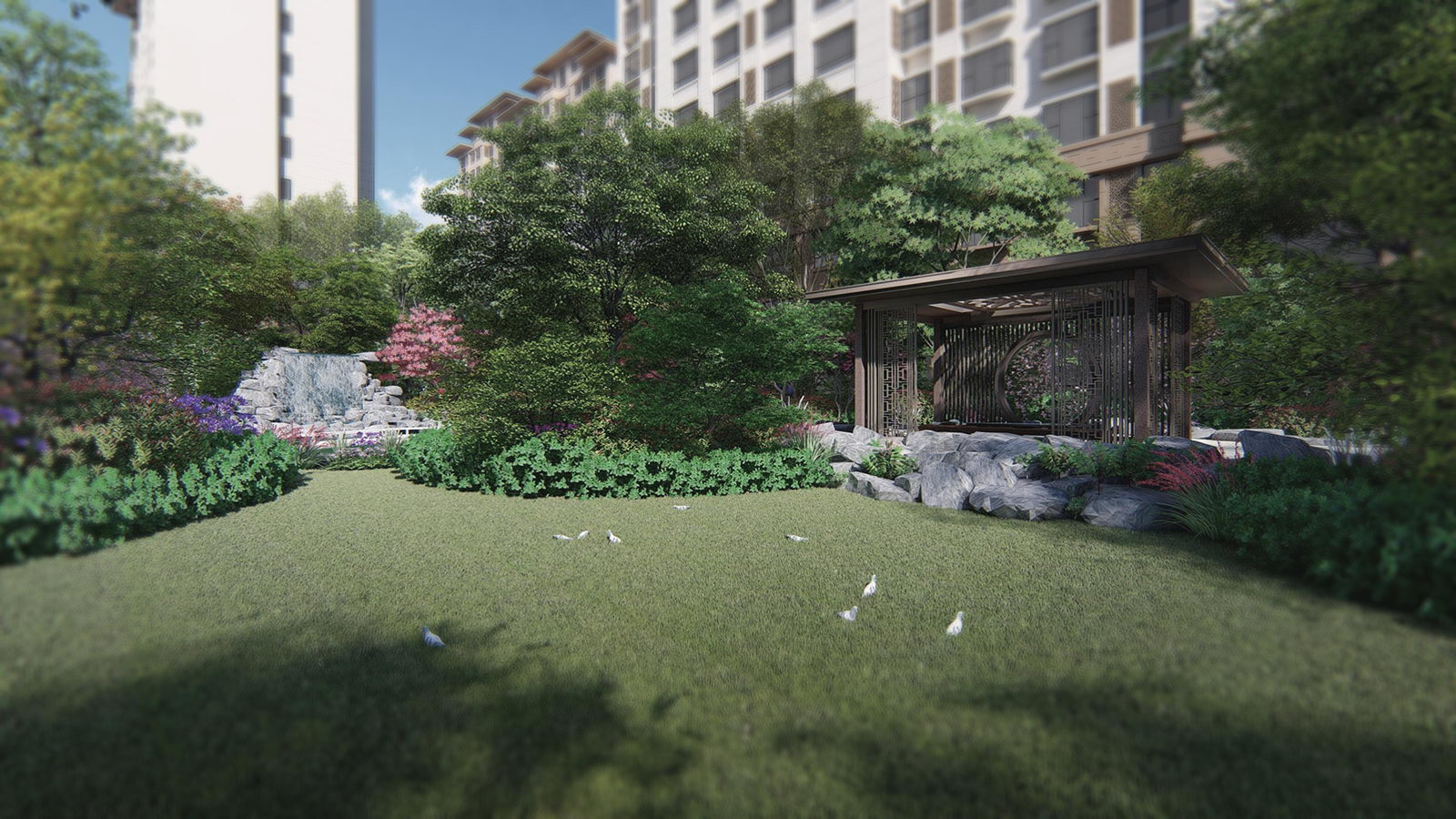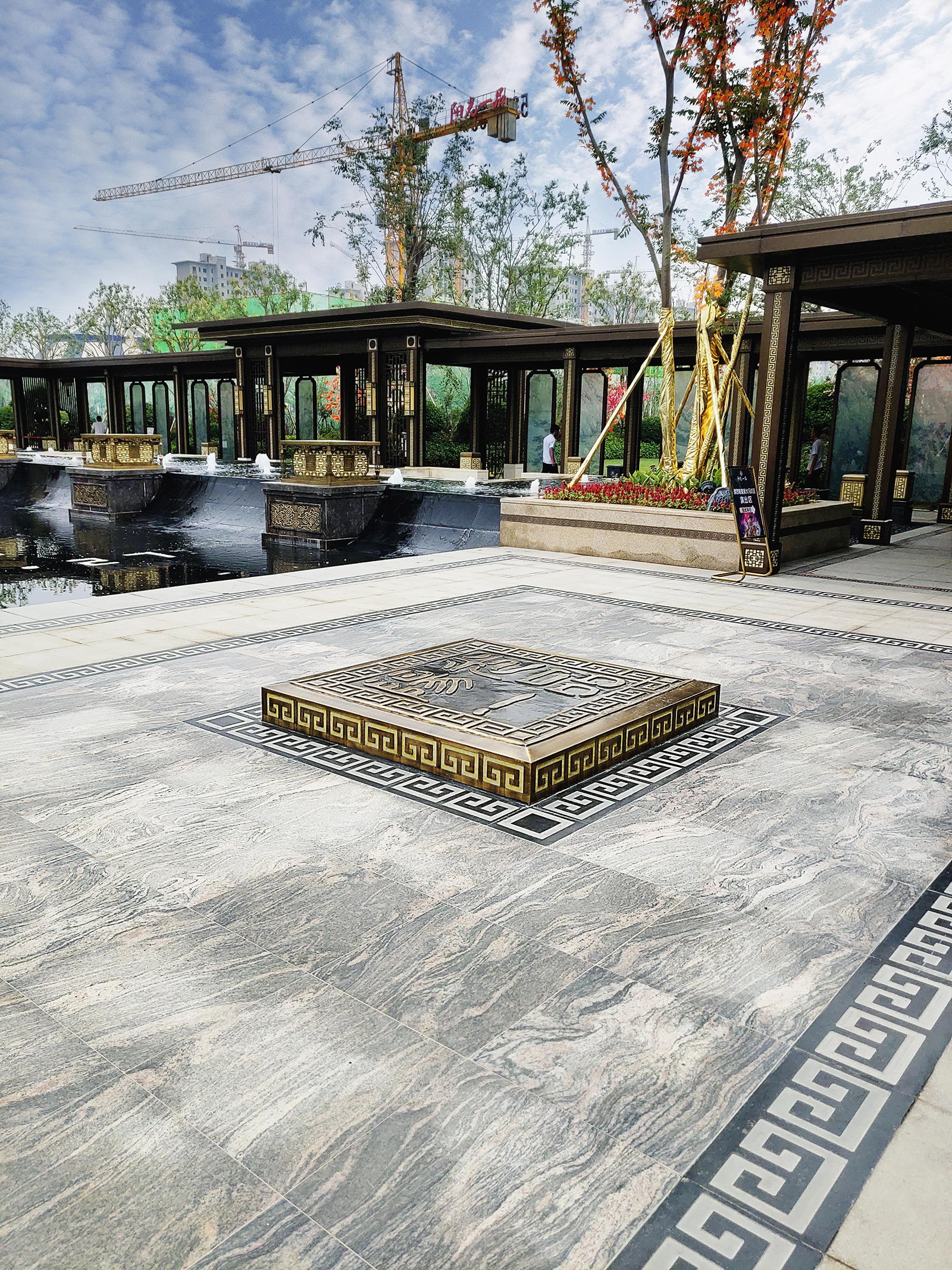鏡面水景輕靈、優(yōu)雅、致韻;雙排四座宮燈雕琢萬字符,寓意前程萬福。